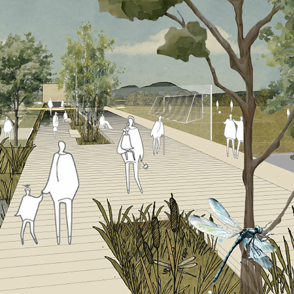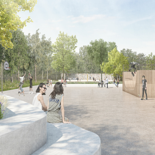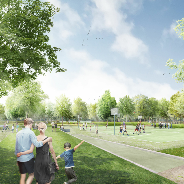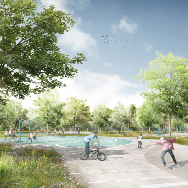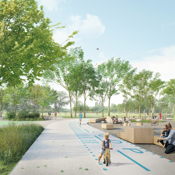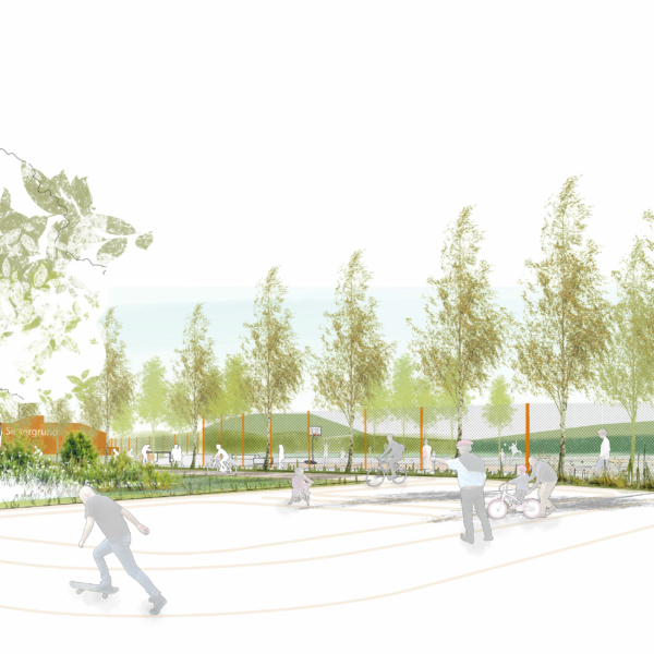 - im Sportpark (1. Bauabschnitt) mit ca. 6,8 ha im Realisierungsteil die freiräumliche Planung der Umgebung von Bike-Park, Stadion und Kunstrasenplatz sowie einer neuen Eingangssituation von Osten und