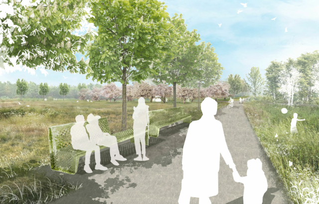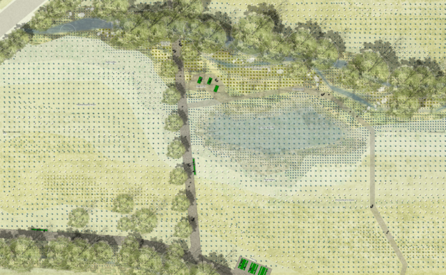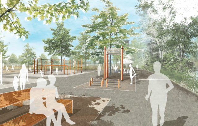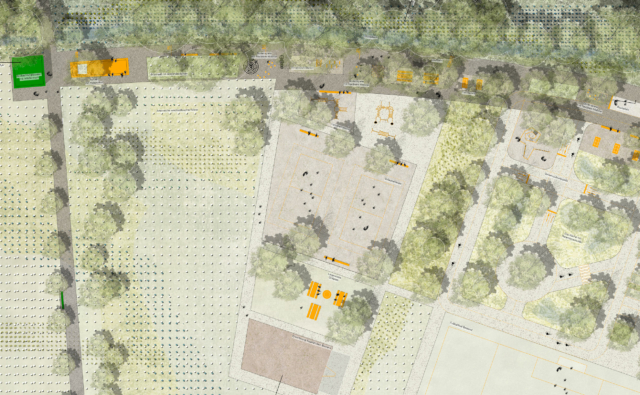 Die Grundidee der vier Rundwege macht die einzelnen Nutzungsbereiche ablesbar und nutzt das bestehende Wegenetz auf wirtschaftliche Weise. Mit der Betonung der Sickershäuser Straße wird der Eingangsbereich zum Sportpark städtebauliche herausgearbeitet, allerdings ist die Entwicklung zur „Sportachse“ mit zahlreichen Sportgeräten in der Kombination mit der KFZ-Erschließung und der Lage der Parkplätze unverständlich. Die daran angegliederten Sportflächen wirken sehr schematisch und lassen keine attraktive Parksituation entstehen, so dass der Entwurf insgesamt nicht überzeugen kann.