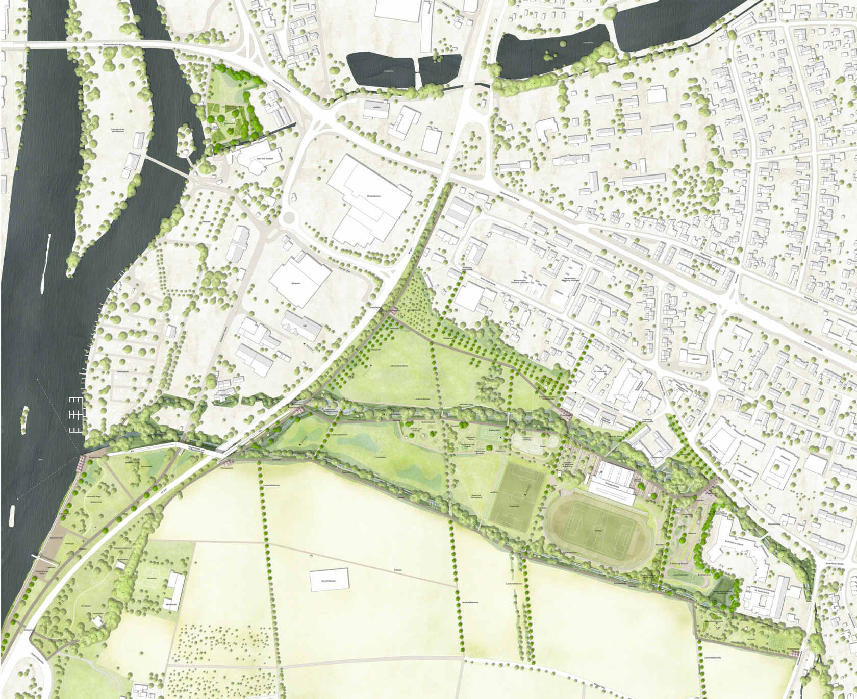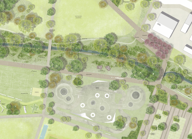 Insgesamt handelt es sich um eine Arbeit, die sorgfältig die Bestandsstrukturen weiterschreibt. Die beiden landschaftlichen Motive der offenen Wiesenflächen sowie des baumbestandenen Mainzuflusses werden zu einem stabilen Leitbild vereint, in welches die Sport-und Spielnutzungen selbstverständlich eingebettet sind.
