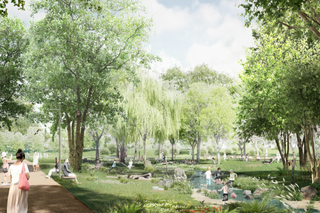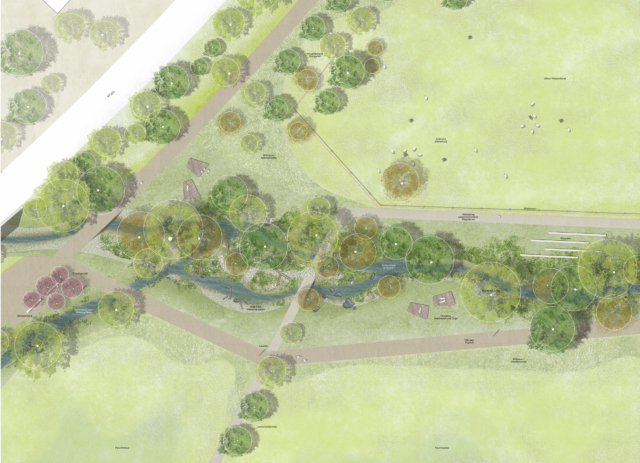 Begrüßt wird die sorgfältige Vernetzung des Sickergrundparks mit den angrenzenden Quartieren und in die freie Landschaft. Eingangsplätze formulieren kleine Aufenthaltsbereiche, die mit Blickbeziehungen in die offene Landschaft verknüpft werden.