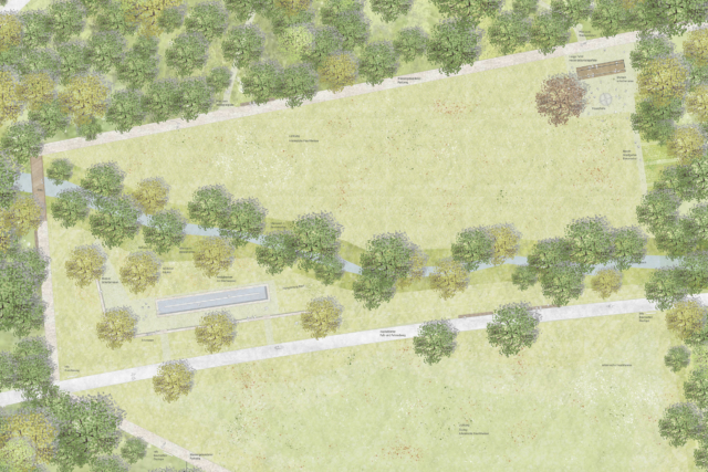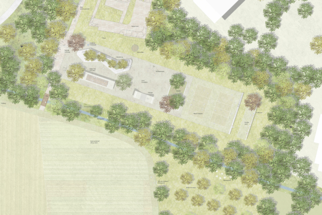 Im Bereich des Sportparks bleibt die Arbeit stark am Bestand orientiert. Parkplatz und Verkehrsschule bleiben an ihrem Platz und werden durch Baumpflanzungen ergänzt. Lediglich angrenzend an den Bike-Parcour werden auf einem Sportplateau informelle Sportangebote gemacht, die in Ihrer Lage auch in der Nähe zur Schule schlüssig erscheinen, deren Realisierbarkeit aufgrund der feuchten Ausprägung des dortigen Geländes allerdings in Frage gestellt wurde.
