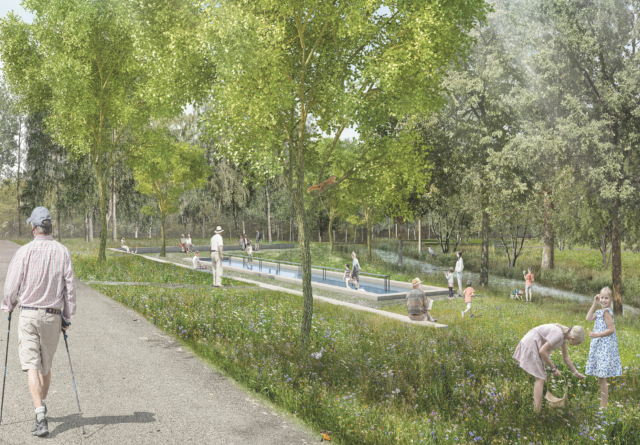 Die Vernetzung des neuen Parks mit dem angrenzenden Stadtraum erfolgt eher zurückhaltend über kleinere Aufweitungen und Infotafeln. Die Wegeführung innerhalb des Waldparks ist differenziert über Wege und Pfade, erscheint aber in sich, vor allem im Übergang zum Sportpark, nicht überall schlüssig.